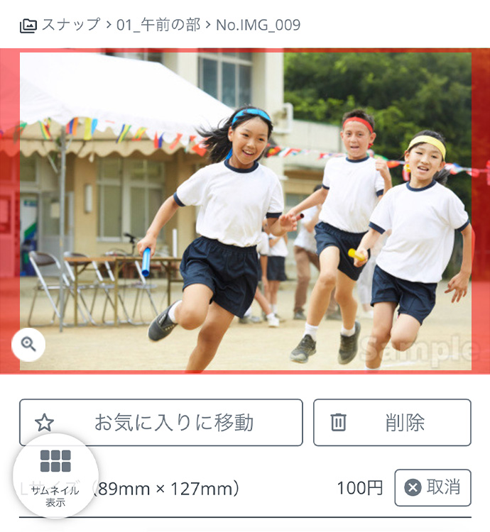 サイズを追加すると、サムネイル写真上で実際のプリントイメージ(断ち落とし範囲)が確認できます。